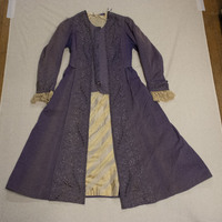 - Purple wool coat with white and yellow striped silk lining.