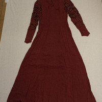 - Crimson red crepe dress with sequined sleeves.