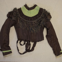 - Brownish-purple bodice with green collar and multicolored fringe trim.