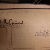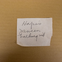 - Cardboard box from Cotrell and Leonard with handwritten note which reads "4 old Jantzen bathing suits." Paper notes read "Hope's very ancient bathing suit," "Hope's Janzen bathing suit vintage 1921," and "Hope's Janzen bathing suit."