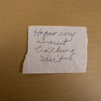 - Cardboard box with handwritten note. Paper slips.