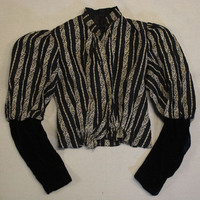 - Bodice of black and cream striped silk with woven paisley pattern.