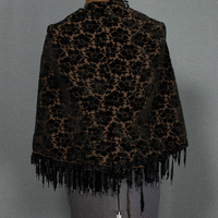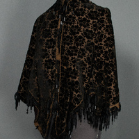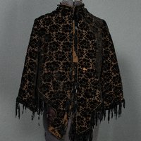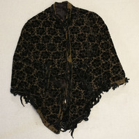 - Black cut velvet cape with floral pattern and fringe trim.