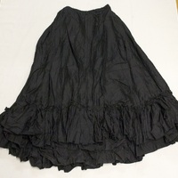 - Black silk skirt with subtle woven grid pattern and ruffles at hem.