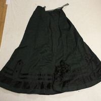 - Dark green wool skirt, possibly faded from original black dye, with black satin trim.