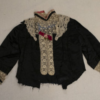 - Black satin bodice with cream lace and pink ribbons.