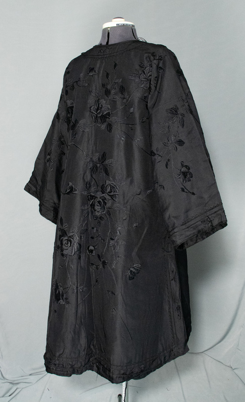 Chinese men's jacket, possibly a traditional Tangzhuang or possibly designed for a western market. The garment is constructed with an outer layer of silk crepe with floral embroidery, a layer of batting for warmth, and a lining of silk pongee. The jacket closes at center front with frogs.